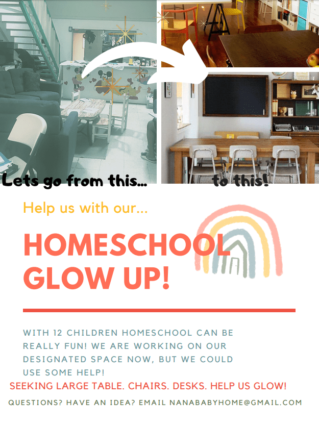Hello! We are working on our “Homeschool Glow Up!” and could use your help! Because all of our children will be distance learning for at least one semester due to COVID-19, we are creating a space that feels like LEARNING! Change is exciting, and we are long overdue. The general living room will become ourContinue reading “Homeschool Glow Up 2020”